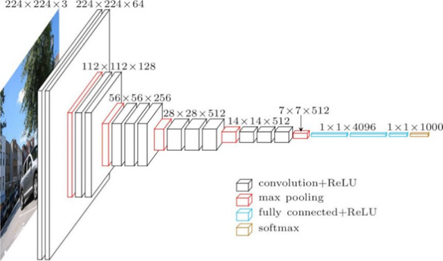The input size for the first layer (Conv 1–1) is 224 x 224 RGB images (224, 224, 3) and padding of 1. The first passage of the filters (3x3) is capable to capture spatial notions as left/right, up/down, center. Pooling is conducted as Max pooling (2x2 windows) and with stride 2. After the convolutional and pooling layers there three fully connected layers (indicated in the scheme as Dense). 4096 units for the first two layer and the last is 1000 units for the last (1 for each of the category in ImageNet). The final layer is a softmax layer.